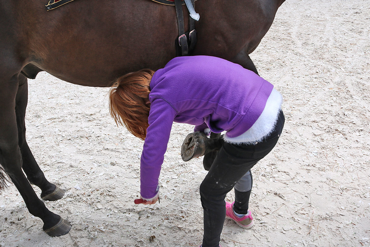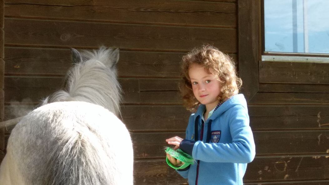 Unsere jungen Reiter*innen lernen nicht nur das Reiten auf dem Platz und im Gelände, sondern auch, wie man ein Pferd artgerecht pflegt, versteht und führt.