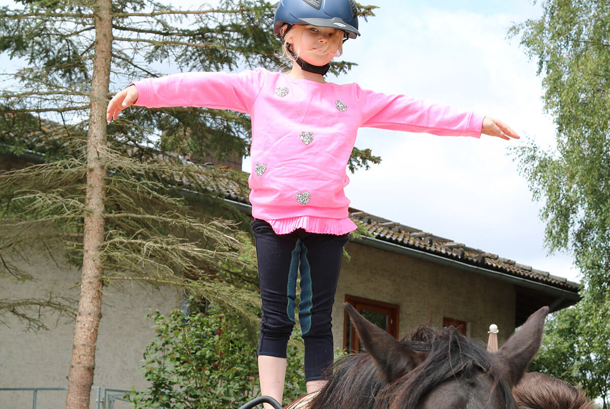 Ob erste Erfahrungen mit dem Pferd oder zur Ergänzung des Reitunterrichts – Voltigieren ist ein ideales Einstiegsangebot, gerade für jüngere Kinder oder Reitanfänger*innen.